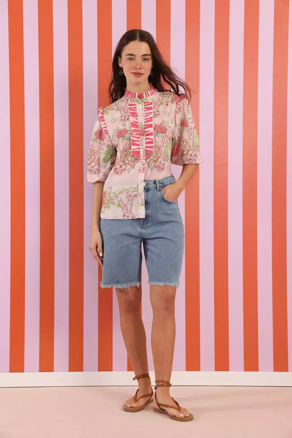 Camisa manga 3/4 cuello redondo, volados rayados en cuello, hombros y cartera