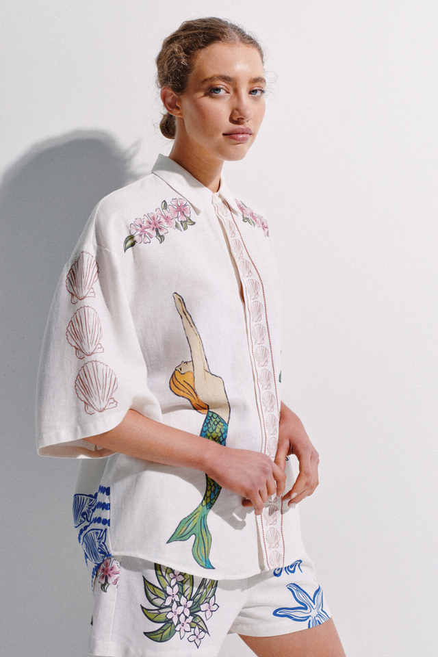 Camisa confeccionada en lino liviano con estampa de sirenas, desarrollada exclusivamente por Justa Petra. Presenta una cartera oculta con botones a tono como terminación. Cuenta con tajos laterales que suman movimiento y comodidad. Ideal para usar en conjunto el Short Tailandia.