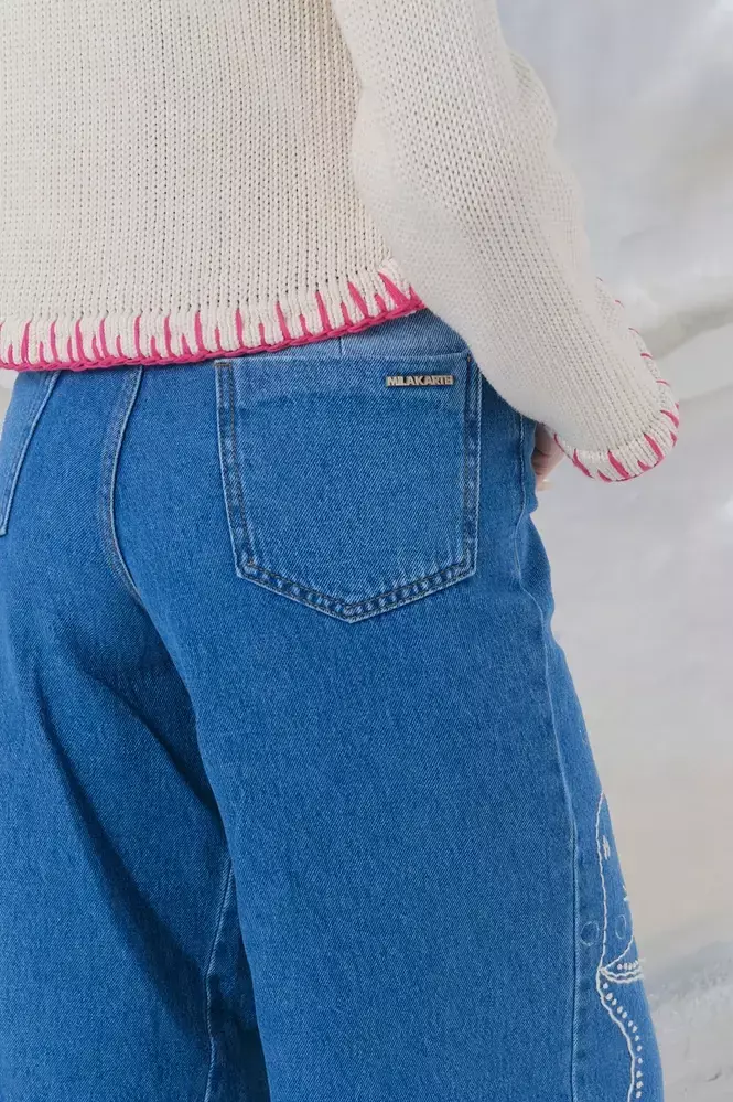 Pantalon tipo 5 bolsillos con un diseño semi ancho. Fit wide, tiro medio y largo hasta el piso . Detalles jeaneros y bordado a mano en toda la superficie delantera.