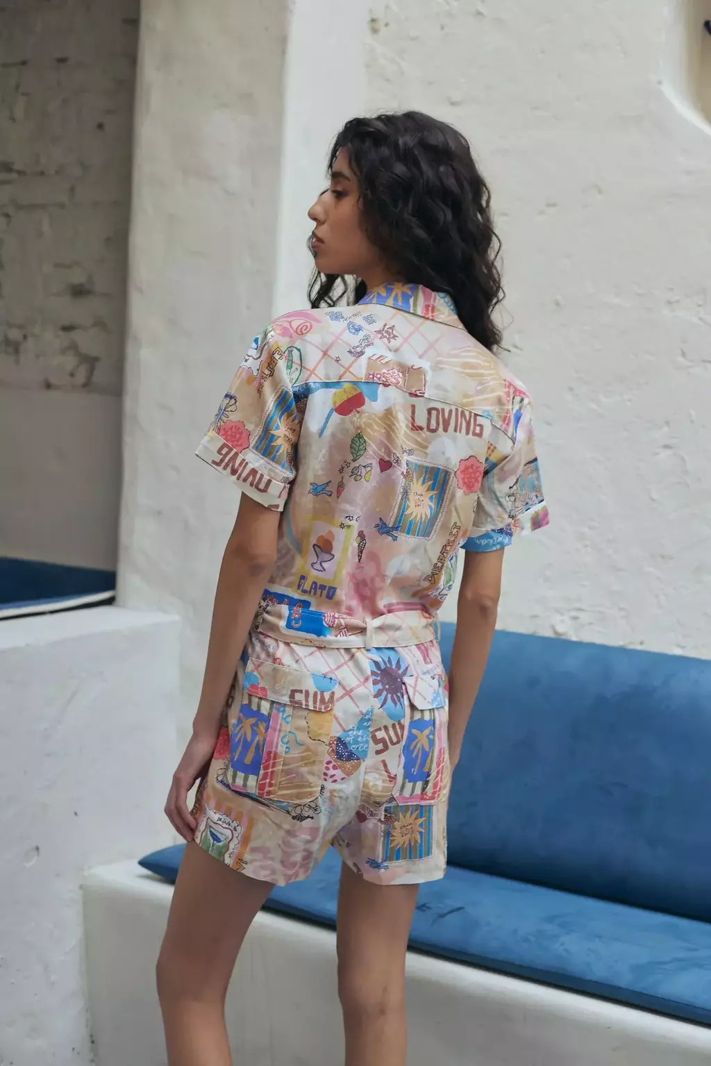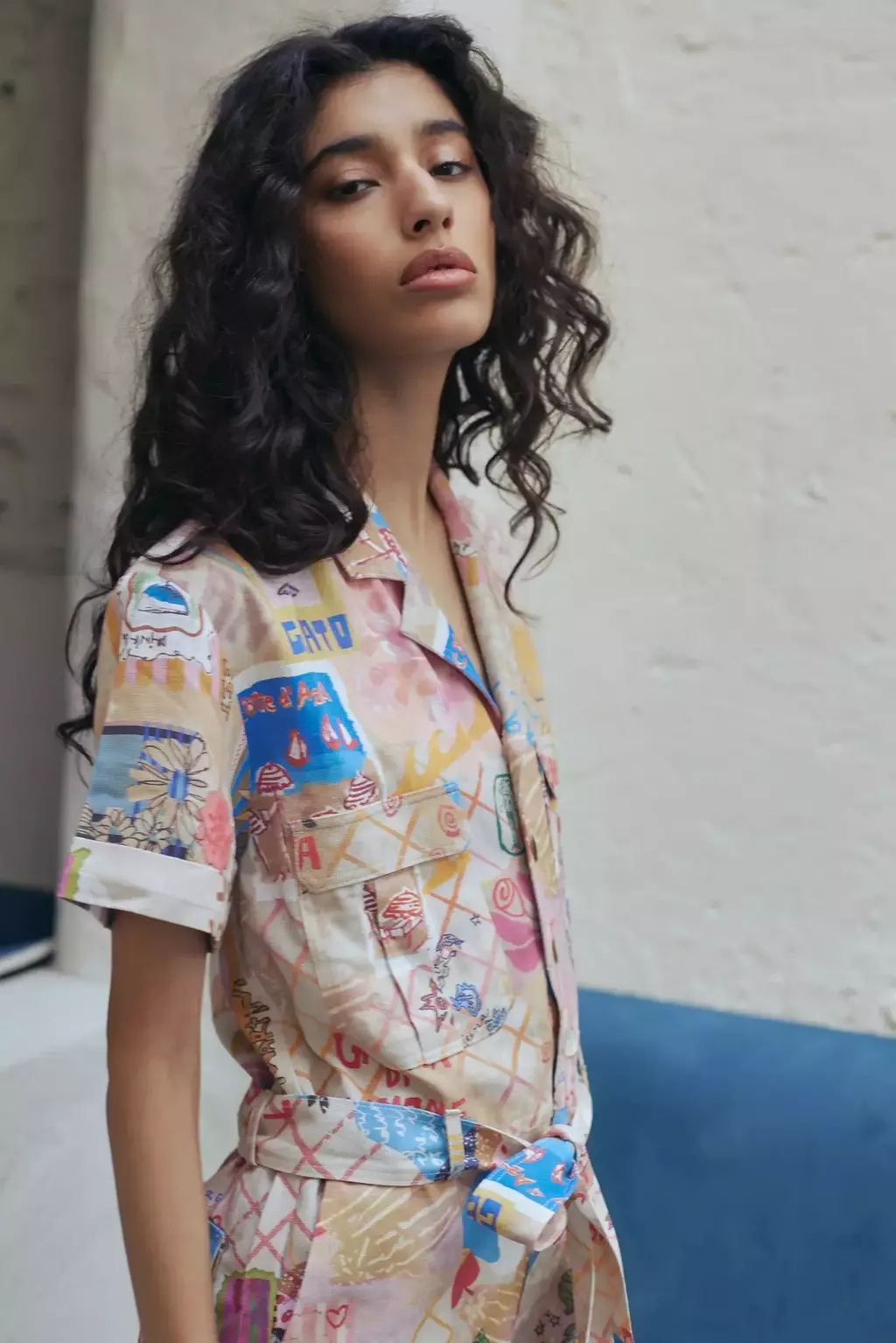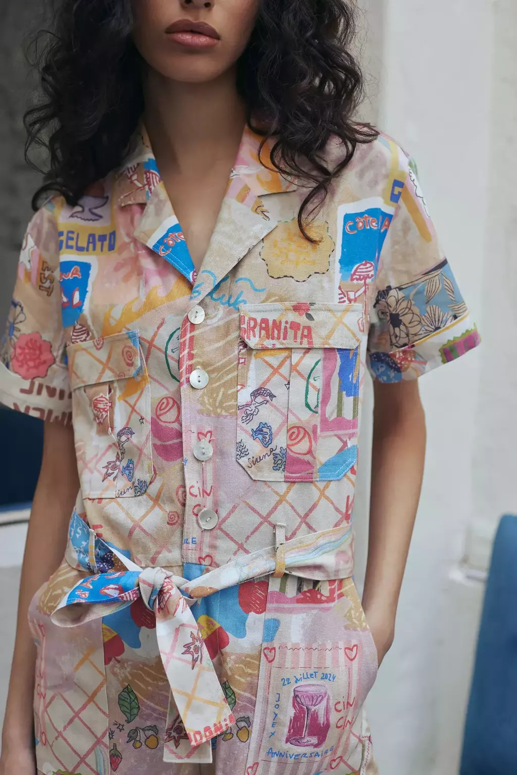 Mono corto confeccionado en lino. De fit suelto con corte en la cintura y lazo. Escote en V con solapa y bolsillos plaque superiores. Una prenda ideal para el verano. Composición 100% lino