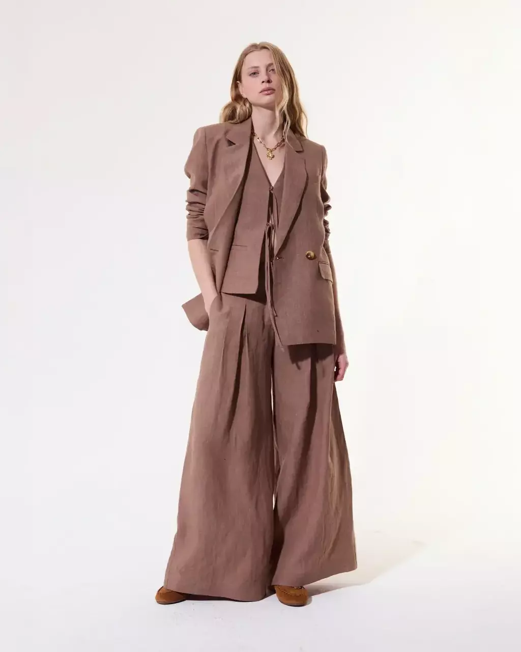 Pantalón wide leg sastrero confeccionado en 100% lino. Tiene dos tablones en el delantero y bolsillos laterales.