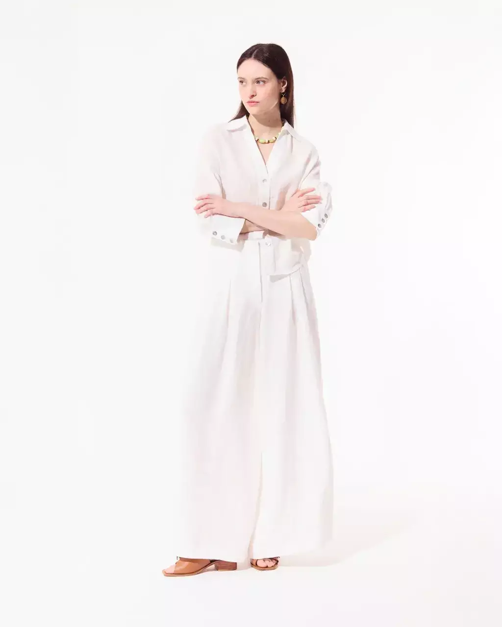 Pantalón wide leg sastrero confeccionado en 100% lino. Tiene dos tablones en el delantero y bolsillos laterales.