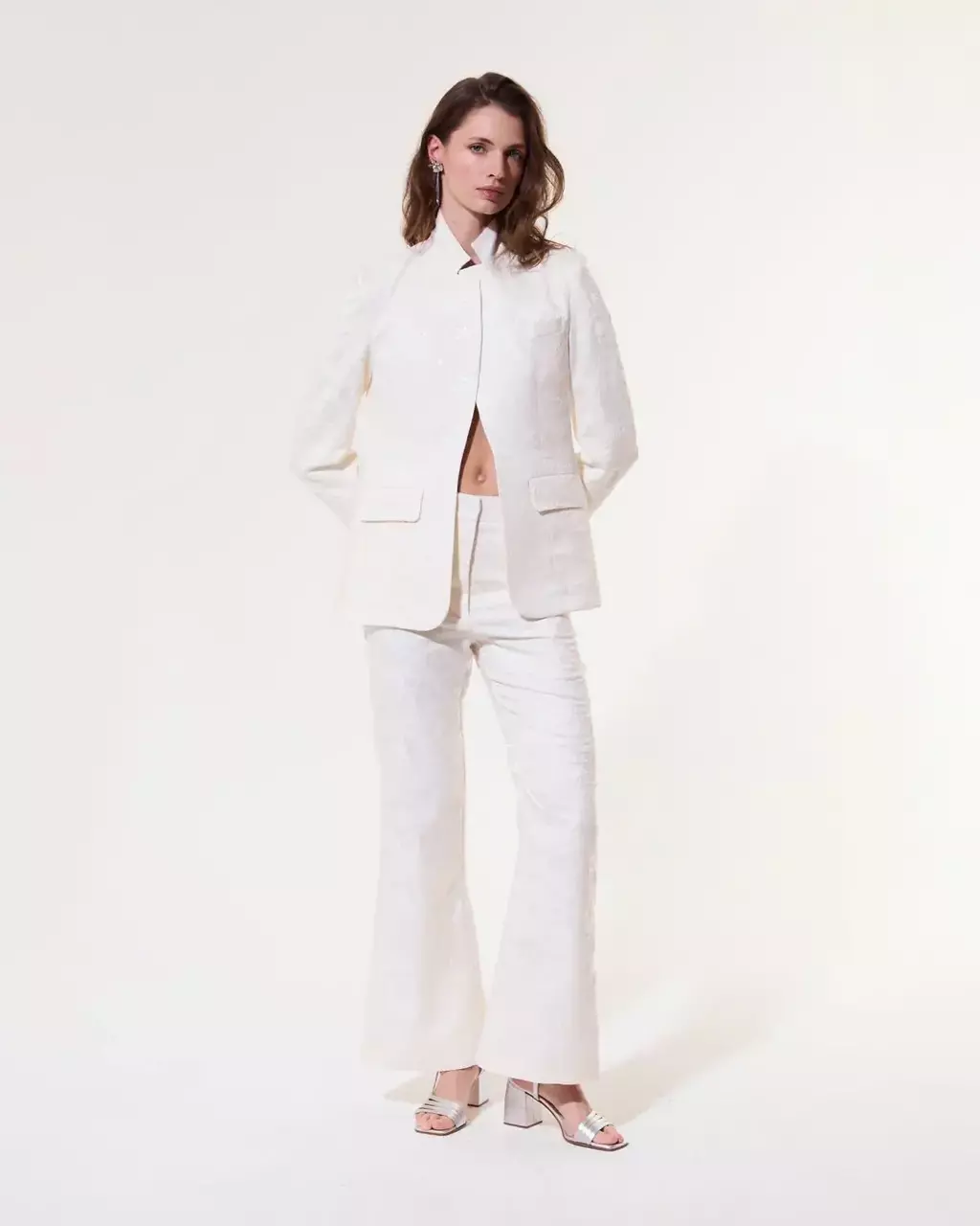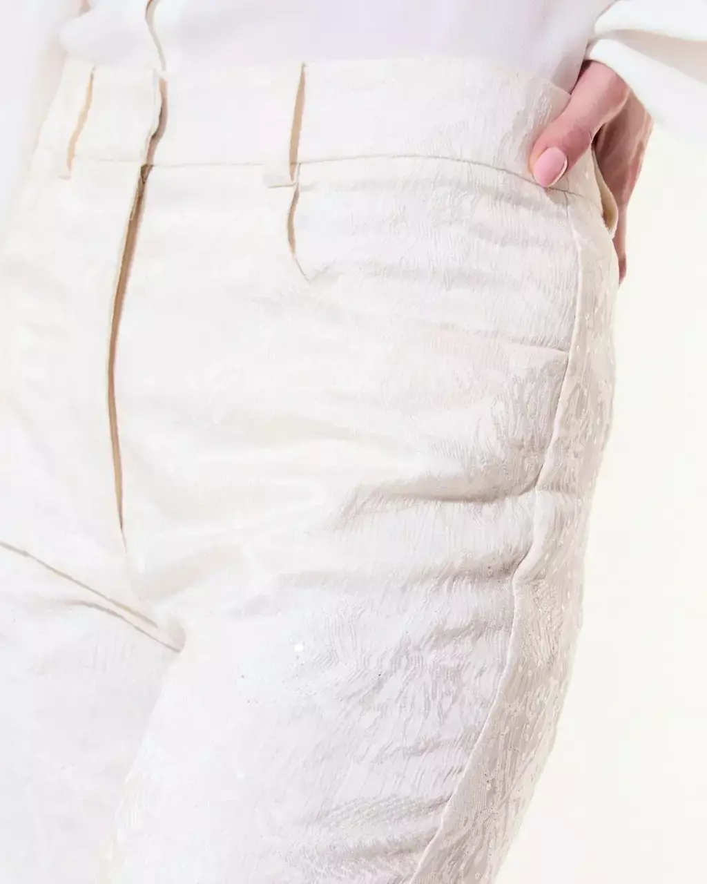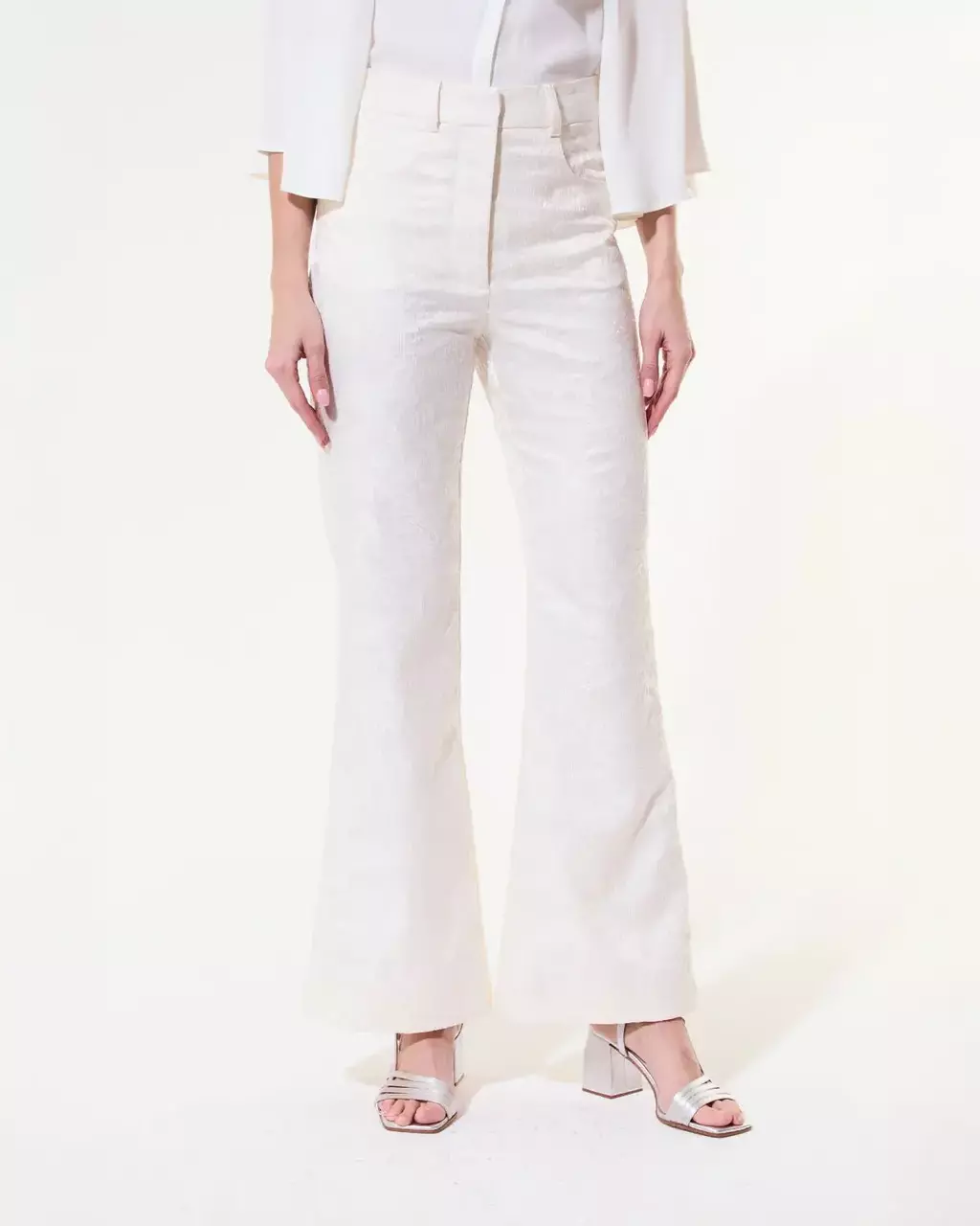 Descripción: Pantalón flare confeccionado en tejido de Jacquard con lentejuelas traslúcidas. Tiene dos bolsillos redondeados en el delantero y dos bolsillos ojal en la parte trasera.