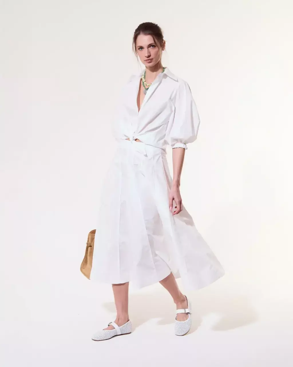 Pollera confeccionada en poplín 100% algodón. Tiene gajos verticales y pespuntes a tono.