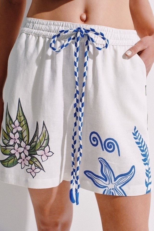 Short confeccionado en lino liviano, con un print exclusivo de Justa Petra. Cuenta con cintura elastizada, y un cordón en tela base con terminales de níquel personalizadas, que suman un detalle de diseño. Ideal para usar en conjunto con la Camisa Tailandia.