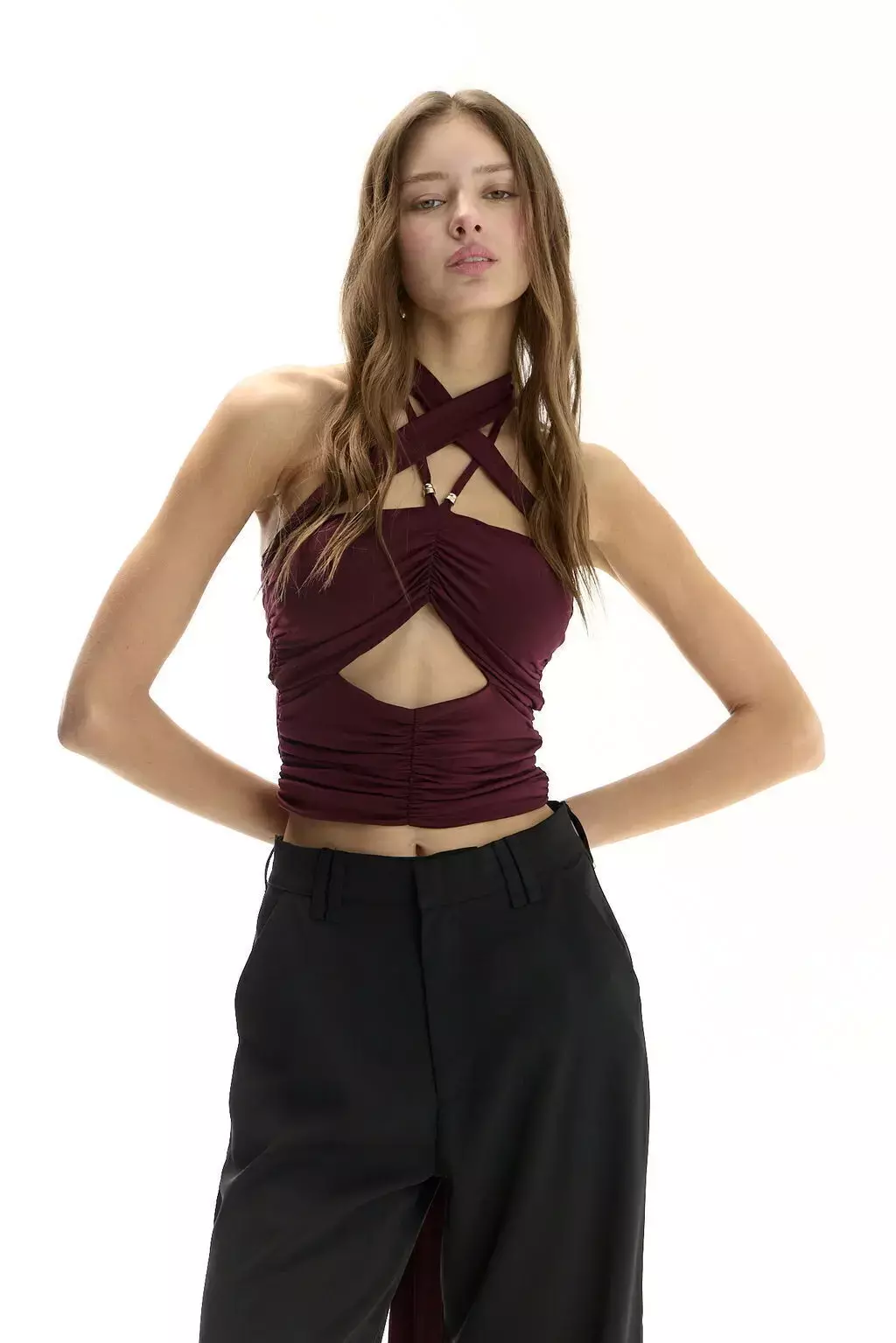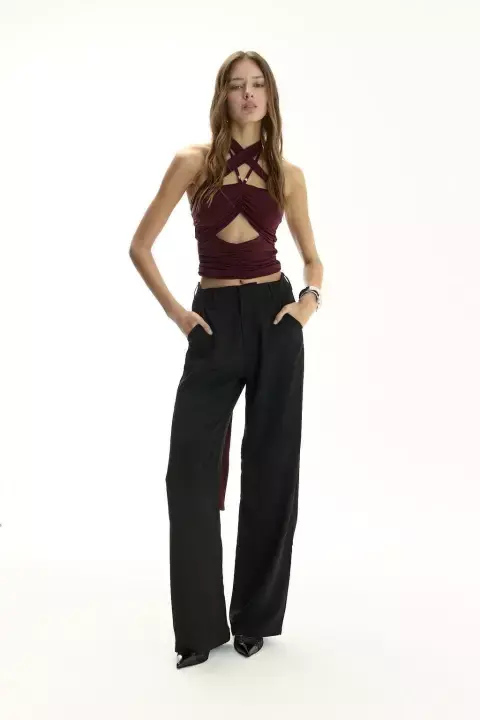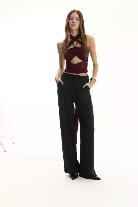 Top tipo strapless con substraccion en abdomen y frunces decortativos a lo largo de toda la prenda. Lleva dos breteles finos que se abotonan detras del cuello y otros dos extra largos y más gruesos que se entrelazan al cuerpo segun el gusto de la cliente. Está completamente forrado y lleva tazas.