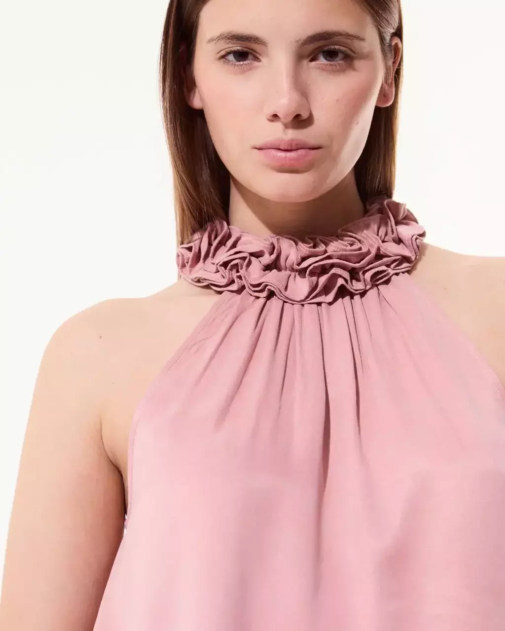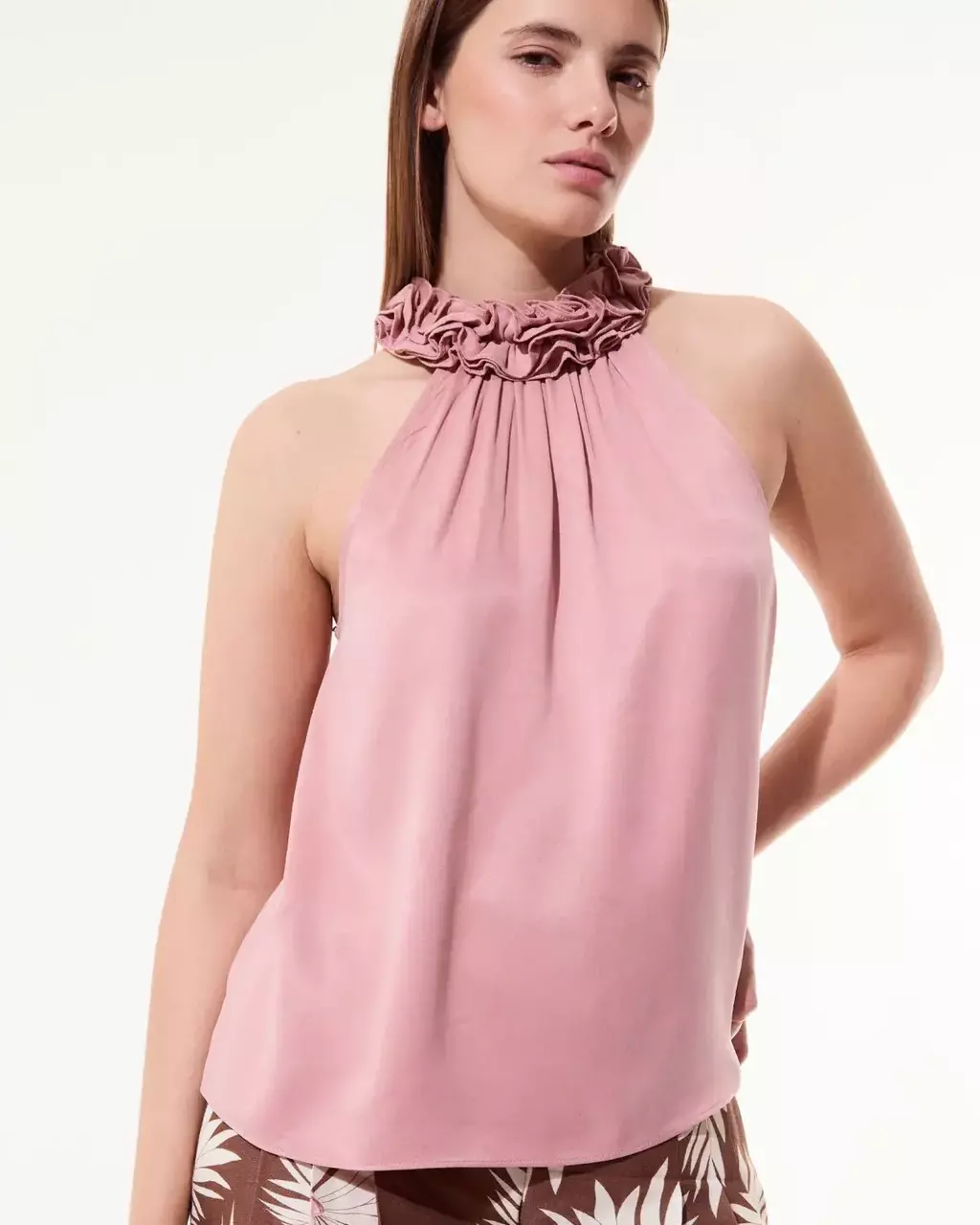 Top sin mangas y escote halter con volados fruncidos en el cuello. Prende con botón y gota en la espalda.