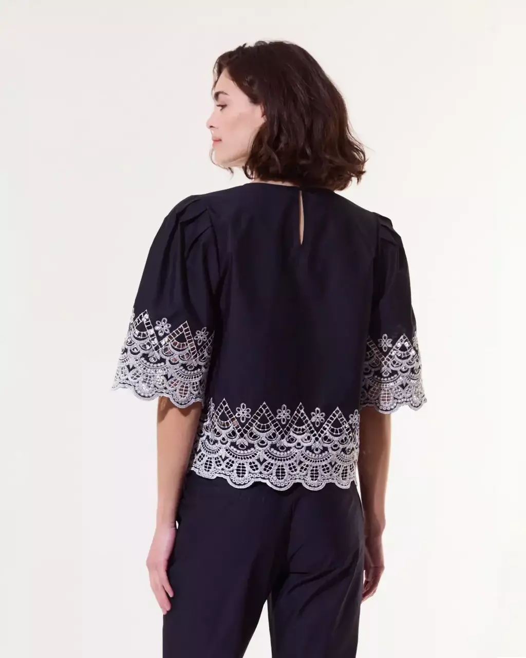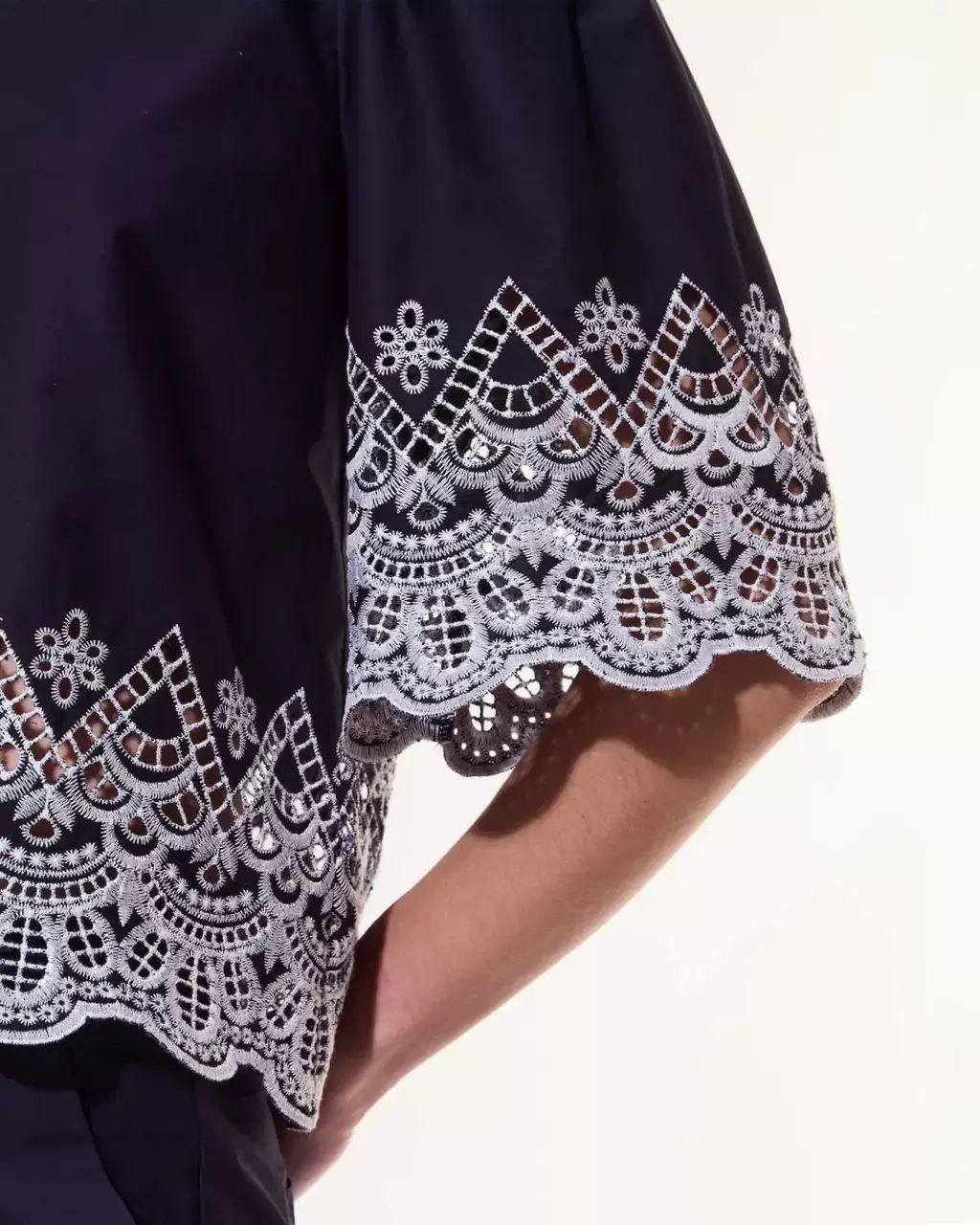 Descripción: Top con manga al codo fruncida y escote redondo. Confeccionado en poplín 100% algodón con guarda a contratono.