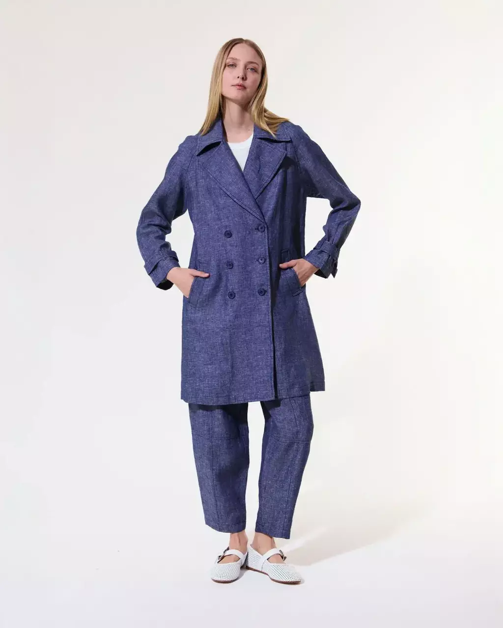 Descripción: Trench cruzado confeccionado en 100% lino denim. Tiene canesú con solapa suelta en delantero y espalda, dos bolsillos ojal diagonales en el frente, presillas en puños y lazo de la misma tela.