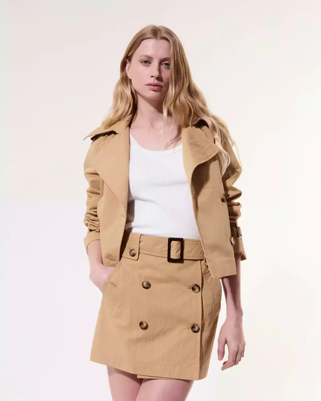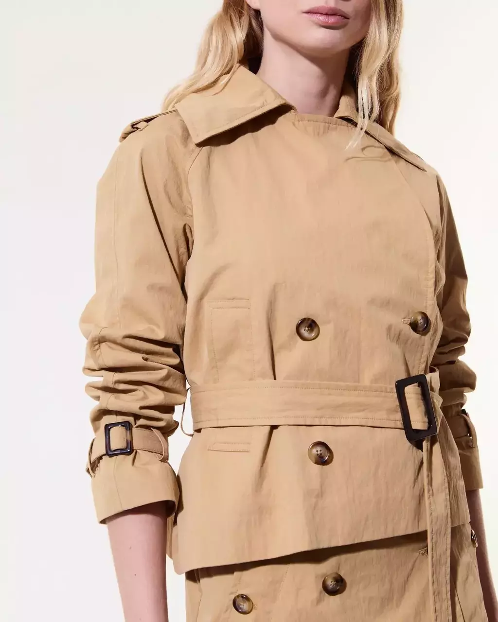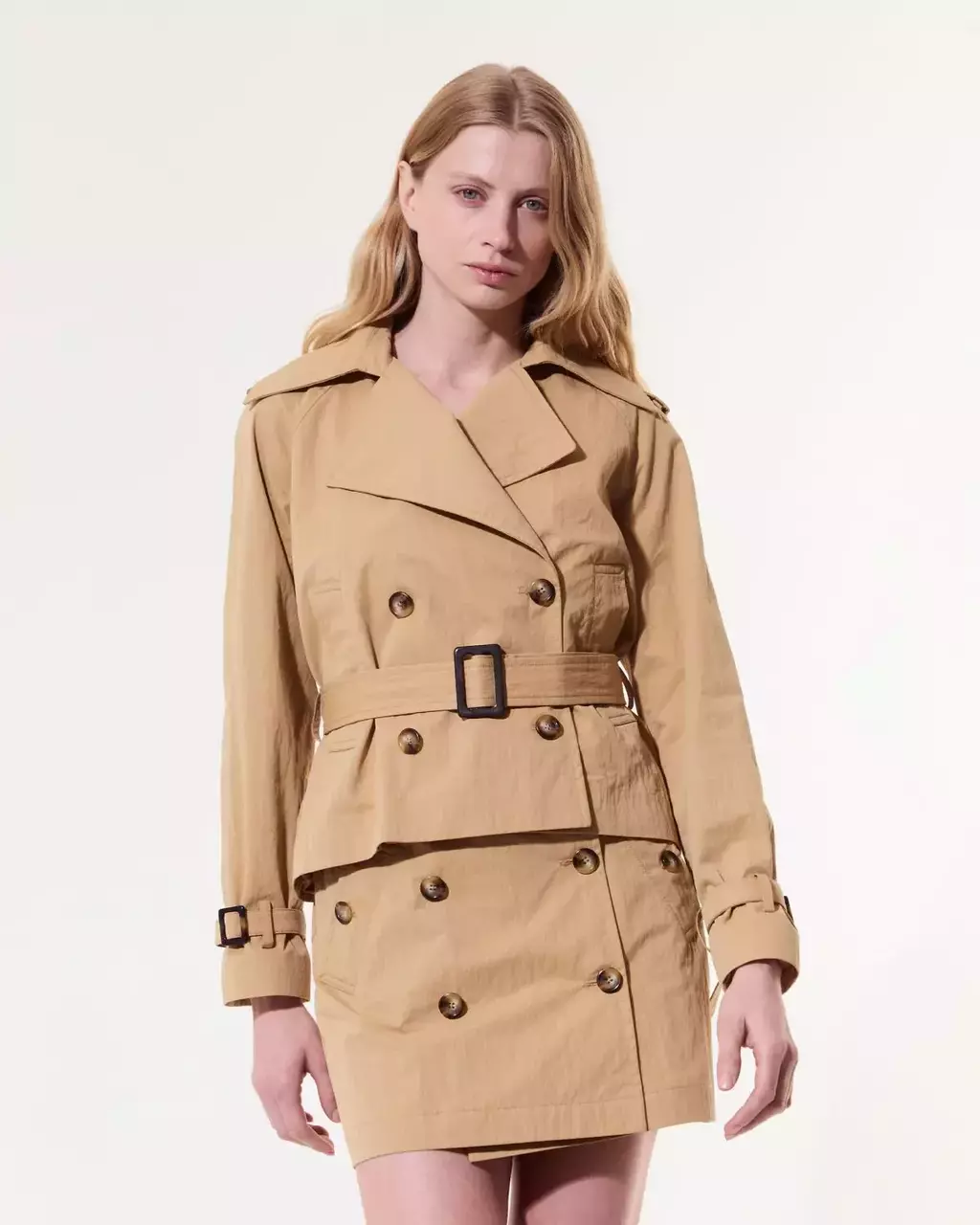 Descripción: Trench corto manga ranglan cruzado. Tiene dos bolsillos diagonales en el frente, presillas en puños y lazo de la misma tela.