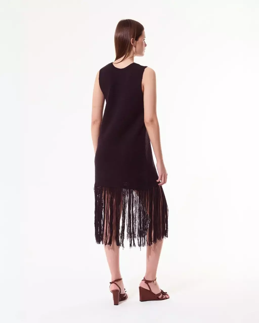 Vestido sin mangas confeccionado en tejido de algodón. Tiene escote redondo y detalle de flecos en el ruedo.