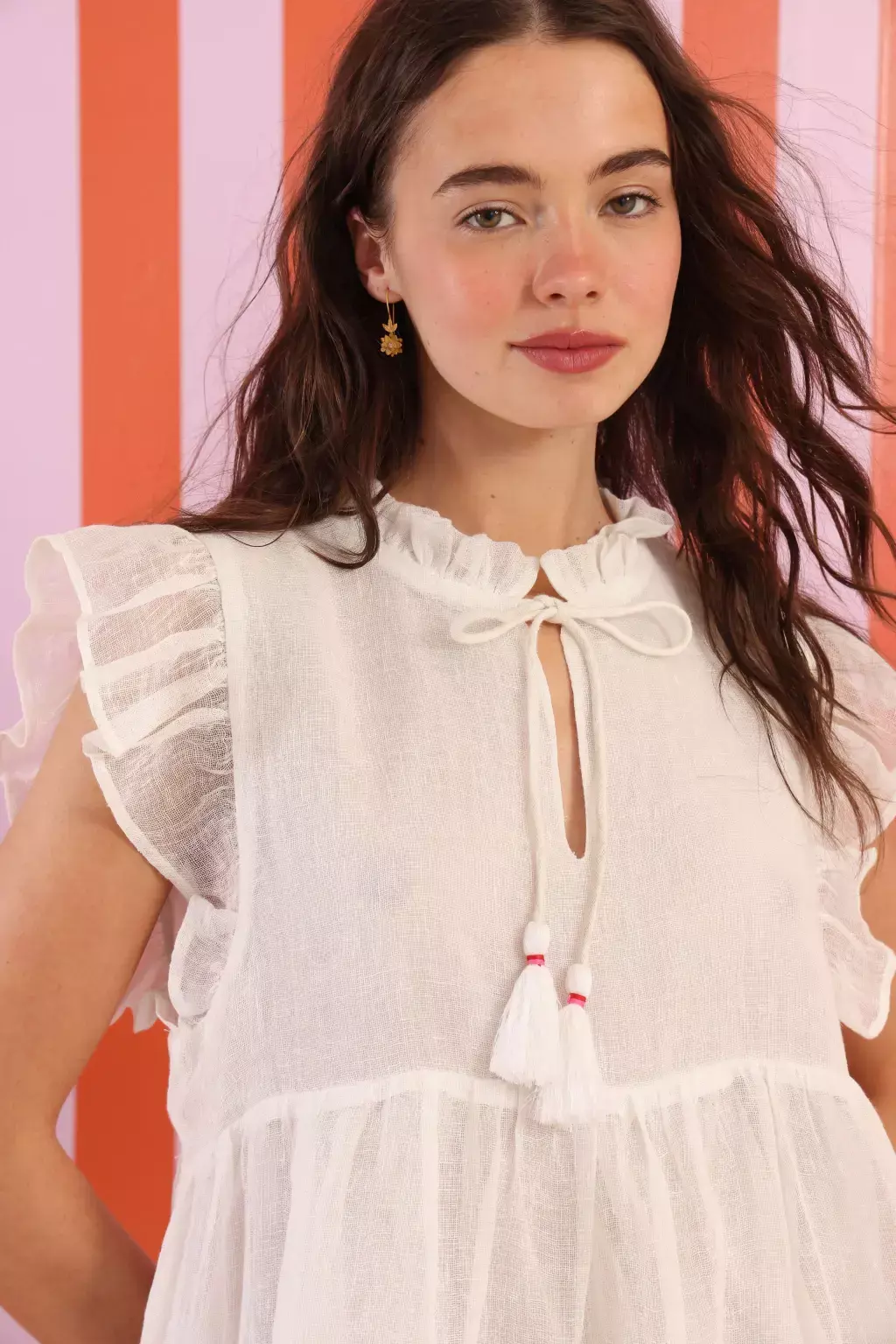 Vestido corto con bordado, lazos en cuello para ajustar, volados en mangas y cuello, falda con paneles. 100% Lino
