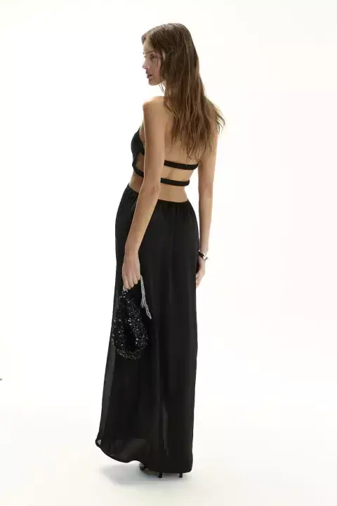 Vestido largo con bretel fino regulable en cuello. Lleva un top pinzado, con abertura en el pecho y elásticos en la espalda. Su falda es recta, con la cintura elastizada y lleva un tajo sobre la pierna. Ambas partes se unen en el abdomen mediante una argolla metálica. Está totalmente forrado.